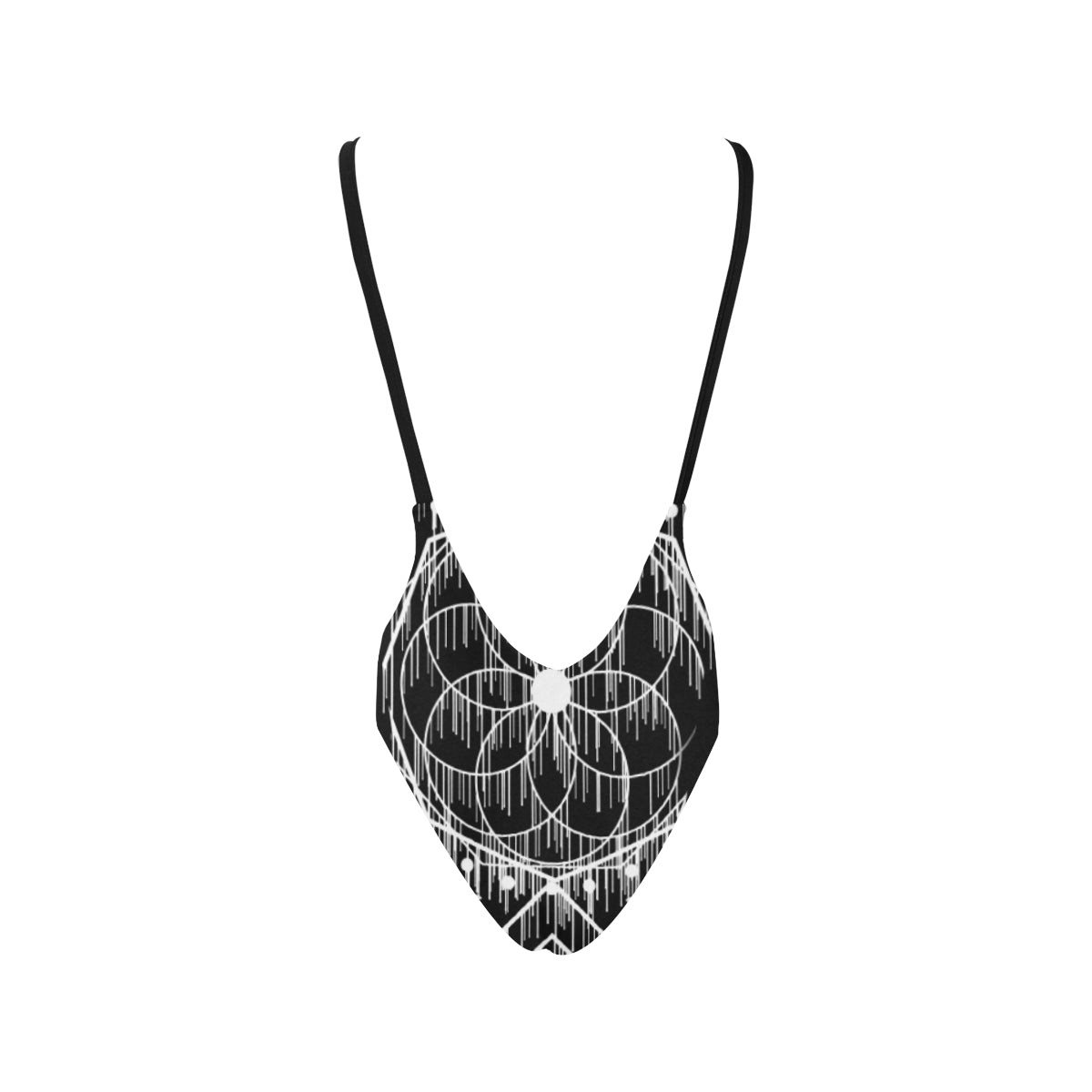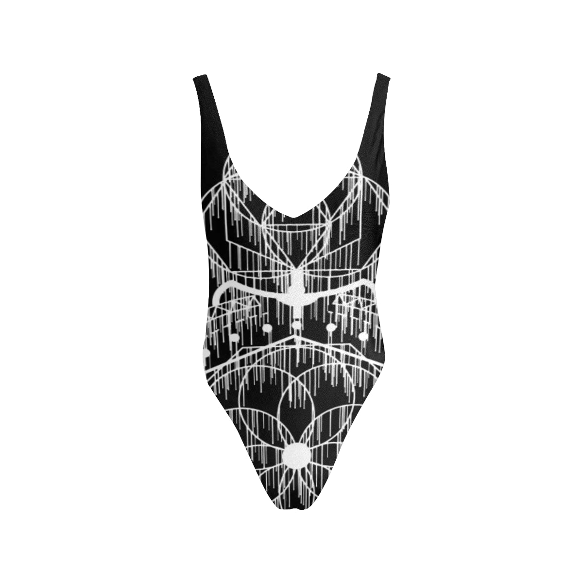 • Deep V neckline, low back and high leg.